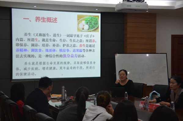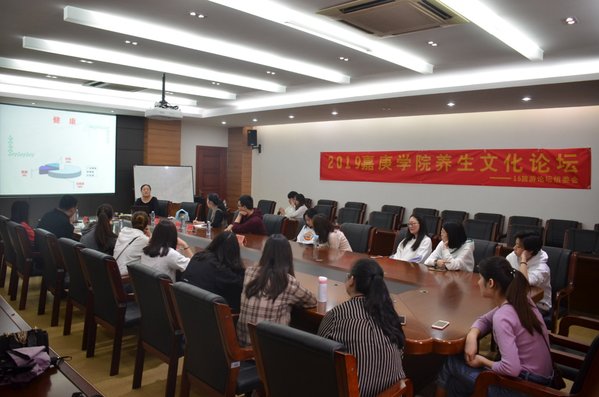 4月8号星期一,16旅游《会展服务与营销》班级的学生们却出现在了经管415会议室,原来今天这里有一场热闹的养生论坛要举办。这次养生论坛是由步会敏老师以及会展班的同学们共同组织的实践教学活动,也是同学们举办的第一场真正意义上的论坛。