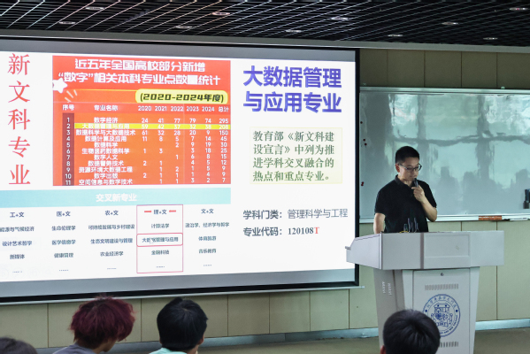 聊完大学规划后周老师切入正题,开始解读大数据管理与应用这个专业。他先给专业定了个性:“这是个典型的新文科专业,教育部在《新文科建设宣言》里特别提到,要重点推进这类学科交叉融合的专业发展。” 接着他解释,这个专业是跟着信息技术发展走的——现在人工智能、大数据这么火,单靠某一个学科的知识肯定不够用,所以才融合了经济学、管理学、计算机科学、人工智能、数据科学这些领域的内容,走的是 “复合型、应用型” 路线。