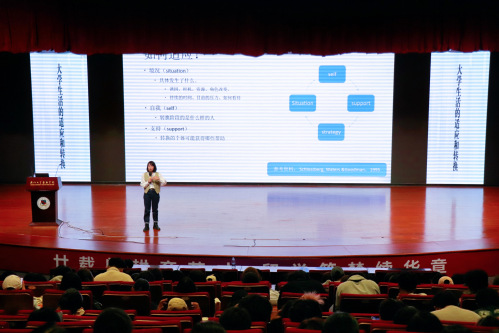 接着,姚老师通过“适应的4个S”理论为新生搭建适应框架,为新生梳理出清晰的行动路径:其一,洞察情境(Situation),锚定新环境,熟悉校园布局、职能分工等“基本盘”;其二,关注转换阶段的自我(Self)发展水平,要树立责任意识,从被动管理转向自主规划,对个人选择负责;其三,积极主动构建支持(Support)网络,善用老师、同学、家人及学院资源化解难题;其四,优化应对策略(Strategy)则要以规律饮食、科学作息调养身心,为应对各类挑战筑牢身心基础。